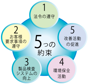そのような姿勢で当社の製品の、管理、販売の姿勢を「五つの約束」として表現し、これからも益々信頼を高めていきます。